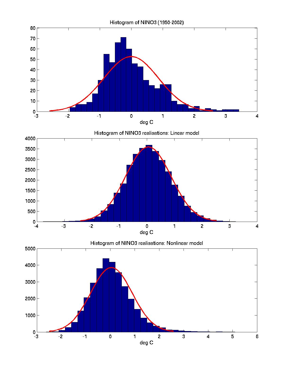 Figure 2. The histogram (bars) and superimposed fitted normal density (solid line) of the detrended observed Nino-3 index, and of Nino-3 stochastic ensembles of both linear and nonlinear models. The nonlinear model captures positive skewness of the observed time series distribution, while linear model does not.