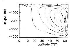 Buoyancy contrasts at the ocean surface result from exchanges of heat and fresh water with the overlying atmosphere, sea ice, or adjacent land through river run-off. These contrasts give rise to a sensitive balance: the ocean water density decreases with temperature (thermo) and increases with salinity (haline). Empirical evidence and model results indicate that its variability ranges from interdecadal to paleoclimatic time scales. Since the THC transfers heat and other quantities laterally, its impact on the climate system can be substantial. The figure shows two snapshots of the (zonally averaged) meridional streamfunction for an interdecadal oscillation using the box GFDL's modular-ocean model in a North Atlantic "box" geometry; the two panels show the strong (right) and weak (left) extremes of the overturning (from Chen and Ghil, 1995, 1996).